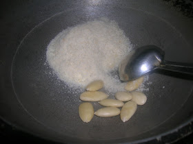 Then, combine milk powder, coconut powder and almond pieces in kadaai and dry roast them till they are golden brown.  Blend them into paste, keep aside