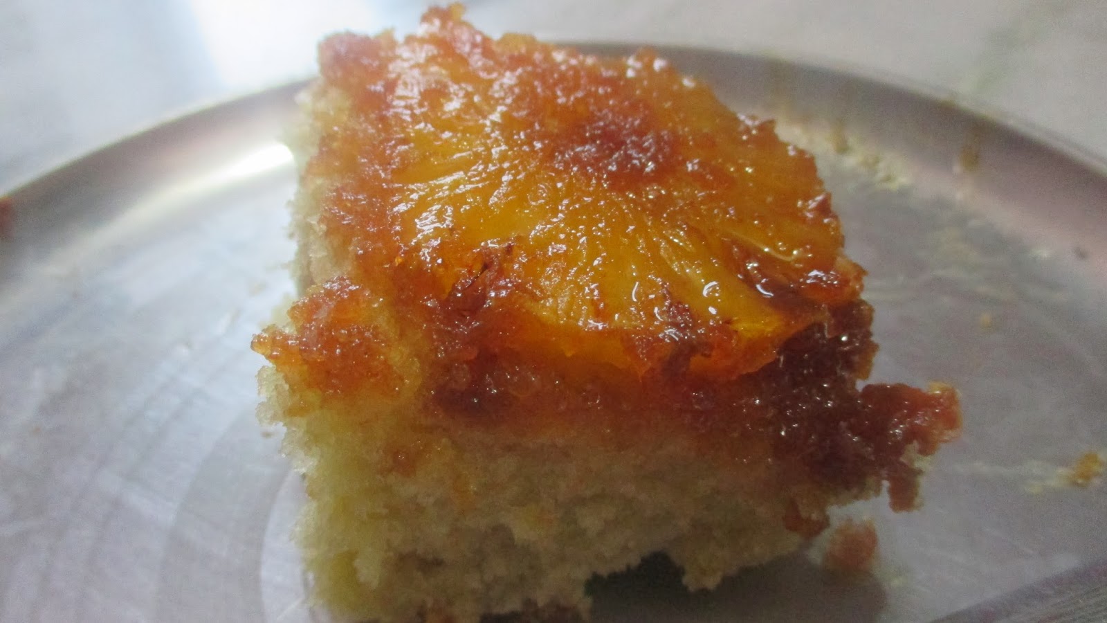 As the name goes, pineapple upside-down cake is baked with pineapples , caramel syrup and Butter cake batter on the bottom of cake dish, later titled upside down and served. Though these are recommended with an dollop of cream, trust me just a hot slice is enough :D